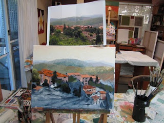 I blocked in the background colours with a brush to eliminate white spots showing through, prior to using the palette knife. The composition had to be modified as it looked too cluttered once the thick paint was added.